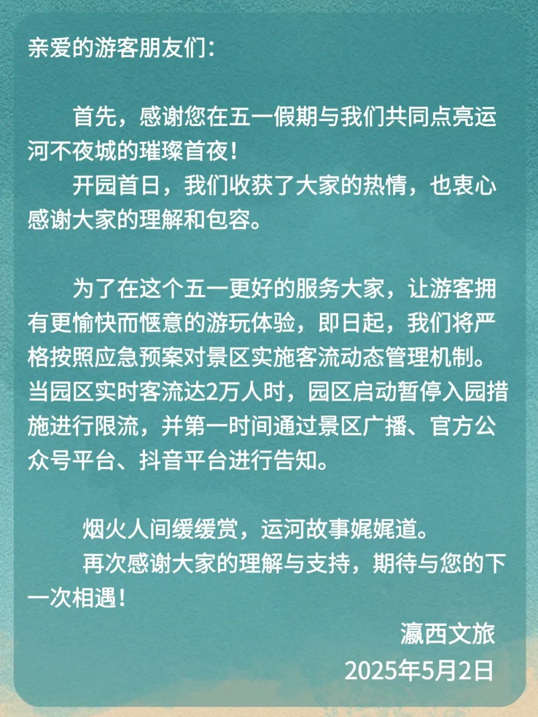 据“美丽武清”报道,5月1日,全国首个运河文化沉浸式文旅综合体武清运河不夜城在武清区河西务镇震撼启幕,吸引众多游客前来打卡。为给游客带来更好体验,景区发布实时限流通告: